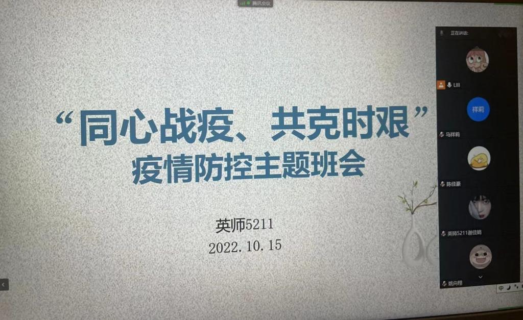 (通讯员 杨吉)10月15日晚七点,VSport各班组织开展“同心战疫 共克时艰” 疫情防控主题班会,此次班会由各班辅导员主持。