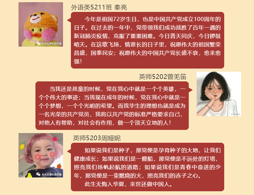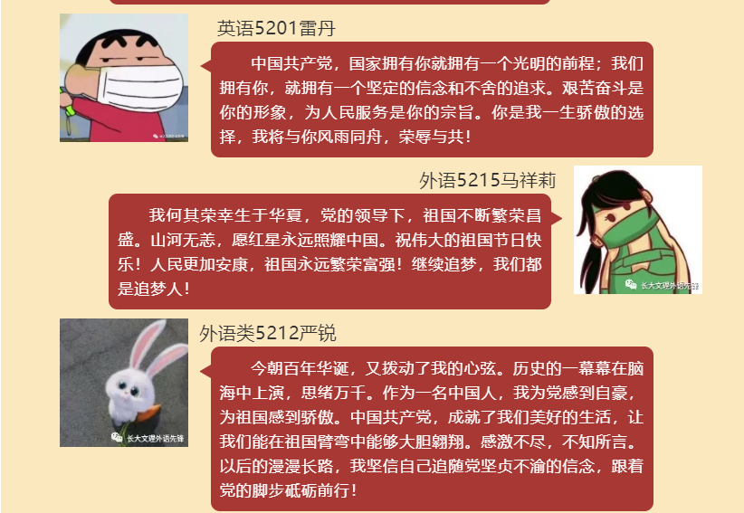(通讯员 朱君瑶)正值建党百年之际,VSportVSport员工党支部开展的“对党说句心里话”活动已经正式落下帷幕。各位同学书写对党和国家的祝福,向党的百年华诞献礼,祝祖国母亲72岁生日快乐!
