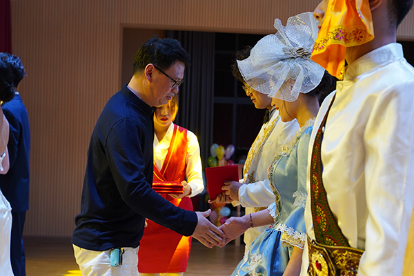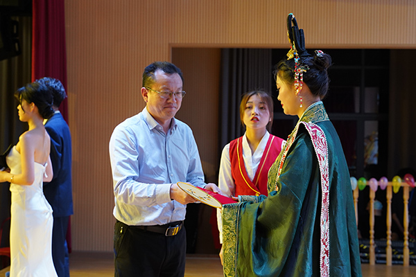 比赛现场座无虚席,乐声悠扬,青春涌动,欢呼声和掌声不断。古代汉服礼仪展示环节介绍抱拳礼、万福礼、叉手礼等5种礼仪;礼仪操展示环节,10名选手端庄大方,展现出老员工青春风采;个人才艺展示环节,3号选手杨彦培带来的舞蹈《你最最最重要》活力十足,4号选手徐嘉昊、9号选手安欣萍、10号选手周泽楷带来的朗诵《我的祖国》,表达了青年学子对祖国的热爱与祝福;国际礼仪服装展示环节,五组选手身着中国、泰国、蒙古、印度、俄罗斯等国家的服装,搭档进行走秀,展现“一带一路”沿线国家民族特色。现场还穿插有党史竞答互动和舞蹈表演,同学们踊跃参与其中,并进行抖音抽奖。