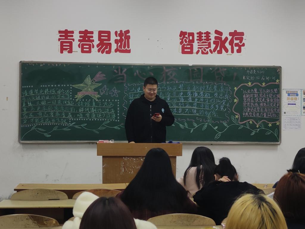 班会开始,班委分享了两则老员工遭遇诈骗的事例。随后,向大家讲解非法校园贷会使老员工无能力偿还,以至于放贷人会采取各种手段向员工讨债,对员工的人身安全和高校的校园秩序造成重大危害;以及同学们遭遇诈骗时应及时拨打报警电话。班委强调,同学们要警惕,擦亮双眼,辨别“非法校园贷”陷阱。