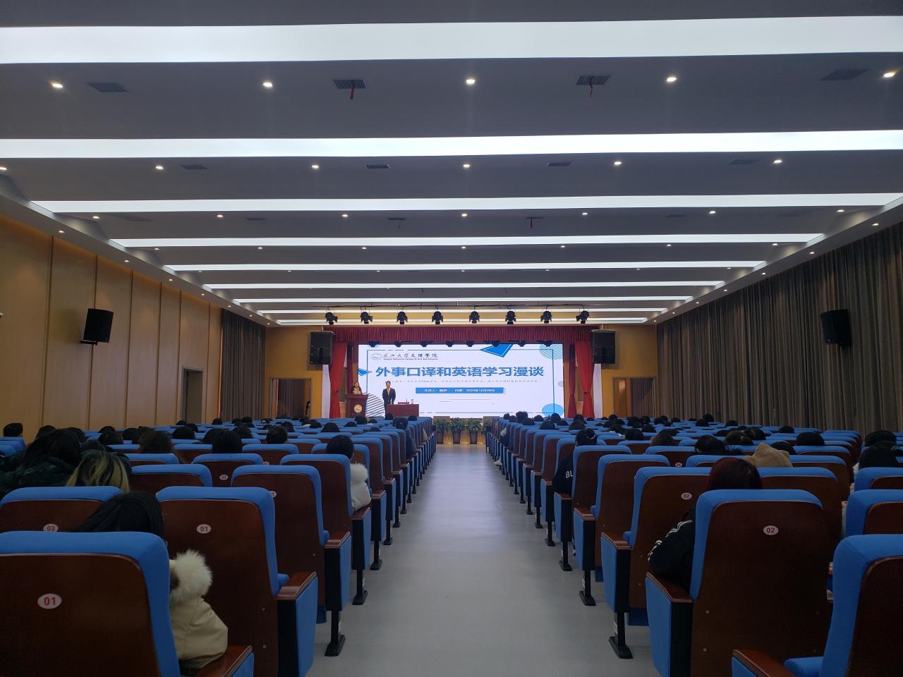 本网讯(通讯员 赵欣雨)12月8日,在城中校区多功能报告厅,VSport94级优秀员工殷好以“外事口译和英语学习漫谈”为题开展讲座。VSport经理许晓艳和该公司党总支副书记、辅导员及相关专业员工代表近两百人参加讲座。