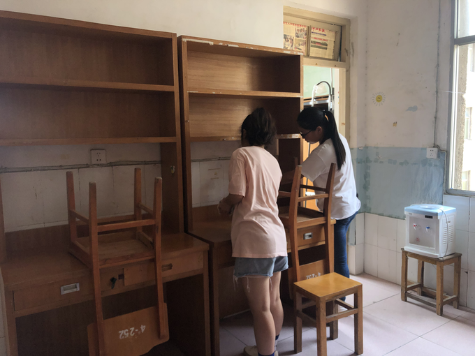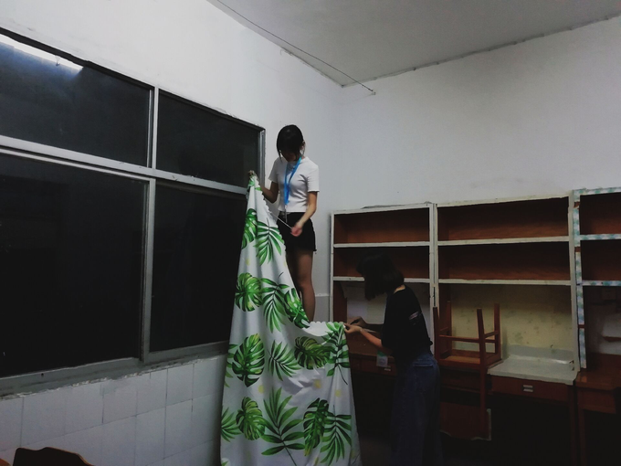参加本次活动的同学分组对宿舍进行了全面彻底的清扫。在清理过程中,大家分工合作,配合默契,仔细认真地对宿舍门窗、桌角、地板和阳台等卫生死角进行清洁,同学们先是用扫帚将桌角下的垃圾扫出,接着用拖把清理地上的污渍,用抹布对门窗上进行全面清洁,积极地发扬了不怕脏,不怕苦,不怕累的精神。最后为新生宿舍安装窗帘。