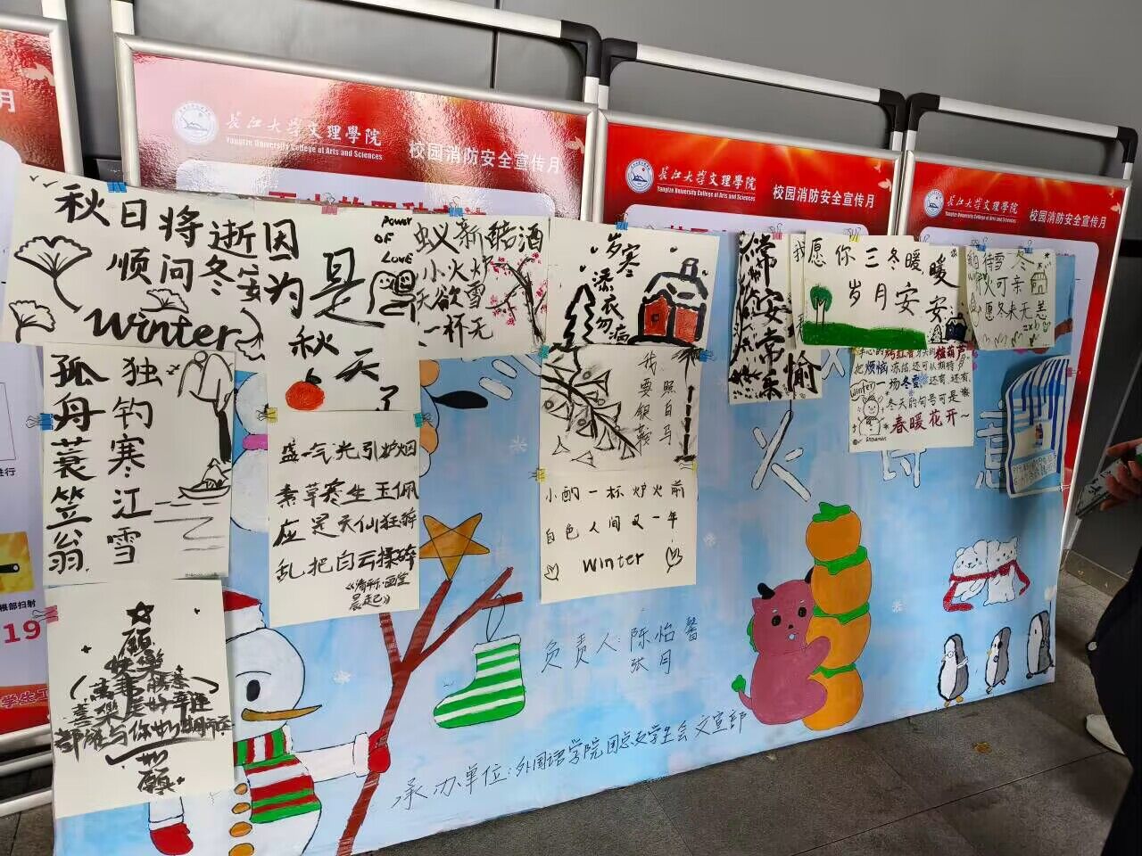 本次活动同学们展现出极大的热情,在画纸上以冬日随想为主题创作诗歌绘画作品,一笔一画绘出内心的柔软。活动期间,文宣部成员积极配合组织活动,引导参赛者们将参赛作品放置到指定地点并拍照留念。