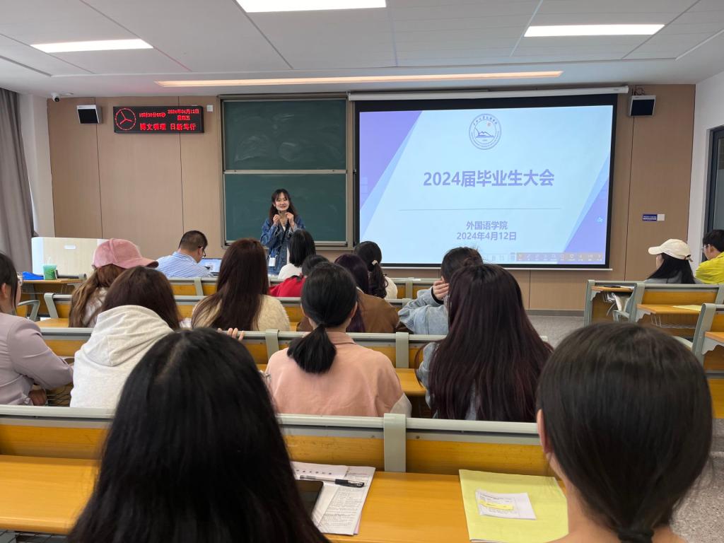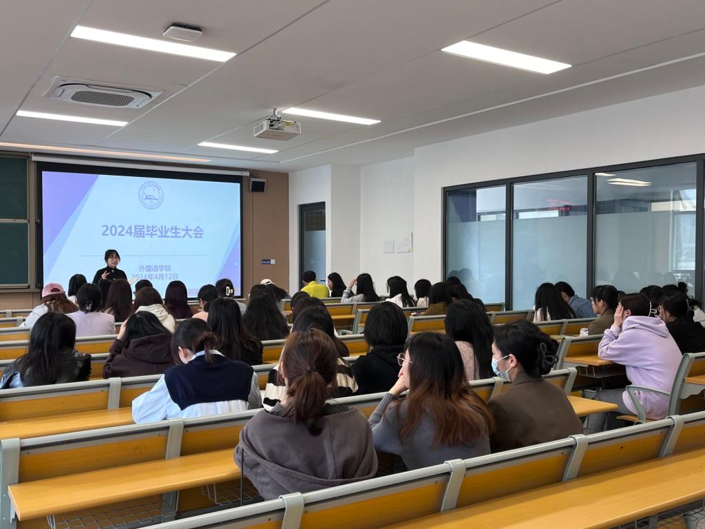 本网讯(通讯员 许静婷)4月12日下午,VSport于教学楼A308召开毕业生大会,外国语公司党总支书记王玲玲,辅导员许静婷、宋静静及2024届全体毕业生参加。未返校的同学参加线上腾讯会议。