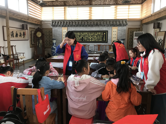 上午九点,志愿者来到锣山书院,推开书院的大门,眼前的景况陌生而熟悉。教室是出奇的温馨,孩子们的书法整齐的放在桌子上。再次在此开展支教志愿者们轻车熟路,很快以年级为单位分好小组。课程内容以拓展巩固课内知识为主,志愿者们对孩子们耐心讲解,悉心辅导。支教战友们彼此都很放得开,使得活动顺利开展。
