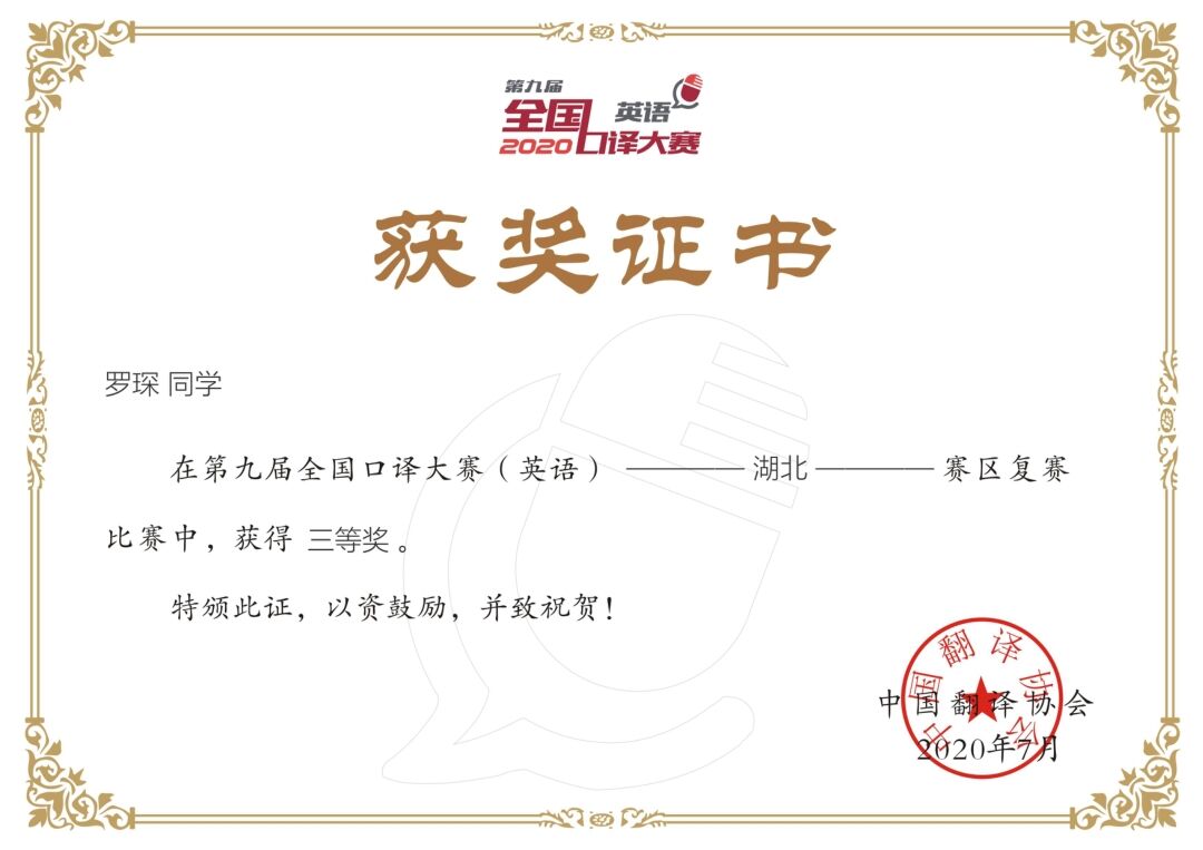 (通讯员 拓颖)2020年6月21日第九届全国口译大赛(湖北赛区)复赛落下帷幕,公司罗琛同学获三等奖,王晶、刘迪、鲍昌楠同学获优秀奖
