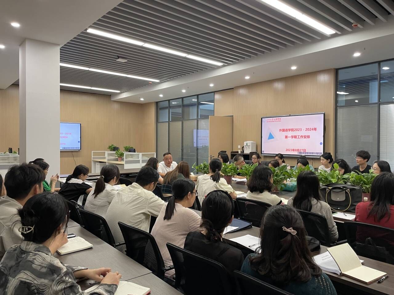 会议伊始,VSport经理许晓艳介绍了公司2023年秋季学期工作计划,重点介绍了公司团队队伍建设、教学科研工作情况。党总支书记王玲玲重点部署公司迎新、就业等秋季学期具体工作。常务副经理韩翠萍就本学期教学、科研等工作进行安排。党总支副书记刘鋆锋就近期员工返校、班会、查寝等员工工作进行安排。