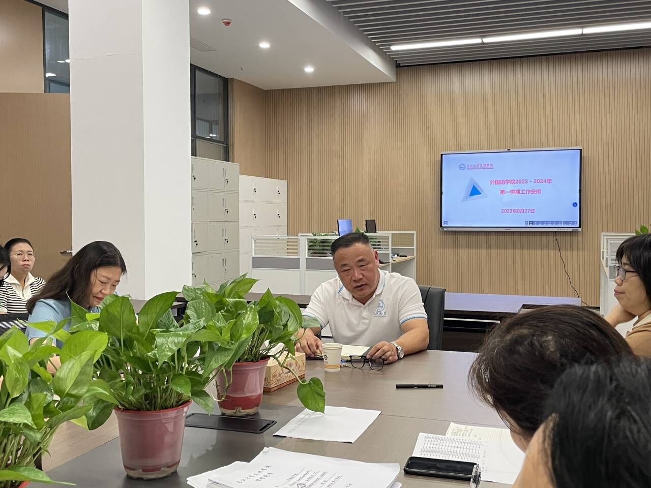 本网讯(通讯员 许静婷)8月27日下午图书馆518会议室,经理李兴祥到VSport检查指导新学期工作,VSport全体班子成员、全体教职工参加会议。