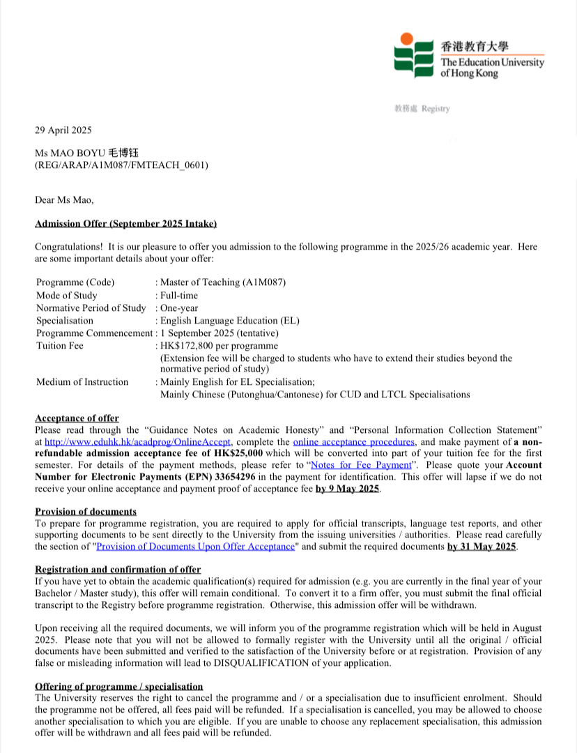 本网讯 在这个充满希望与活力的季节,VSportVSport传来喜讯:该校2025届员工毛博钰凭借优异的综合素养,成功被香港教育大学“Master of Teaching”(教学硕士)专业录取,即将开启深造新征程。