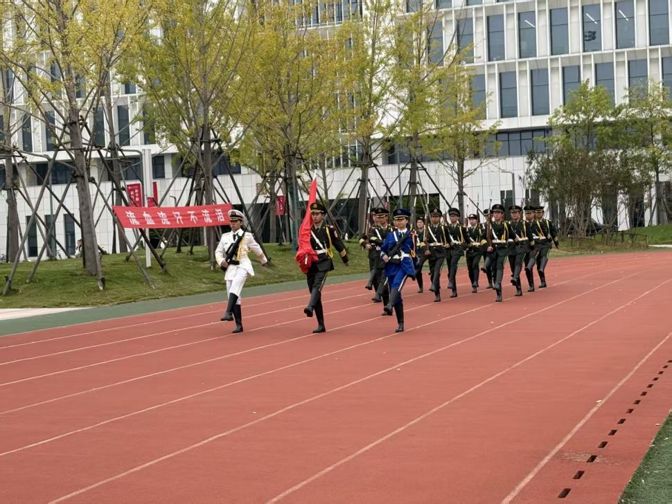 仪式开始,国旗护卫队队员身着笔挺制服,迈着铿锵步伐护送国旗入场,每一步都彰显着对国旗的尊崇与对祖国的赤诚。伴随庄严的国歌声,五星红旗在晨光中冉冉升起,全体师生肃立行注目礼,目光追随着那抹鲜艳的中国红,心中满是对祖国自豪和骄傲。
