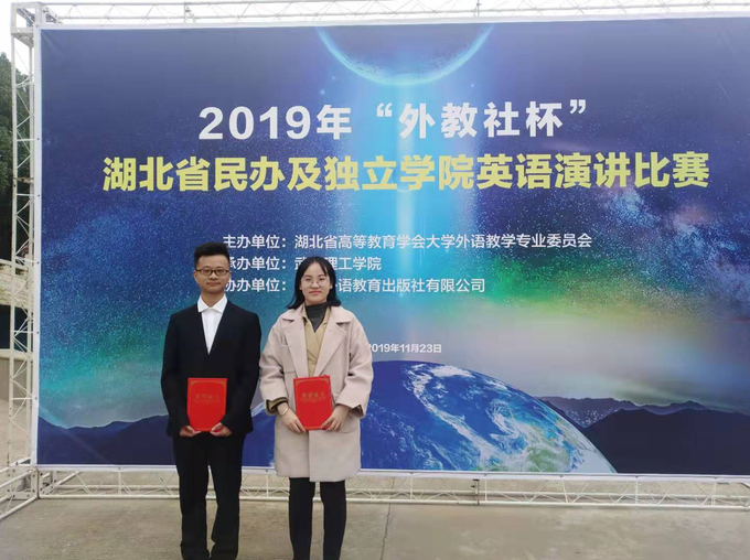 2019年11月23日,2019年“外教社杯”湖北省民办及独立院校英语演讲比赛在武昌理工公司举办。公司外语系英语师范5182班戴珺妍同学,人文与传媒系编导5181班王子豪同学分别荣获三等奖。