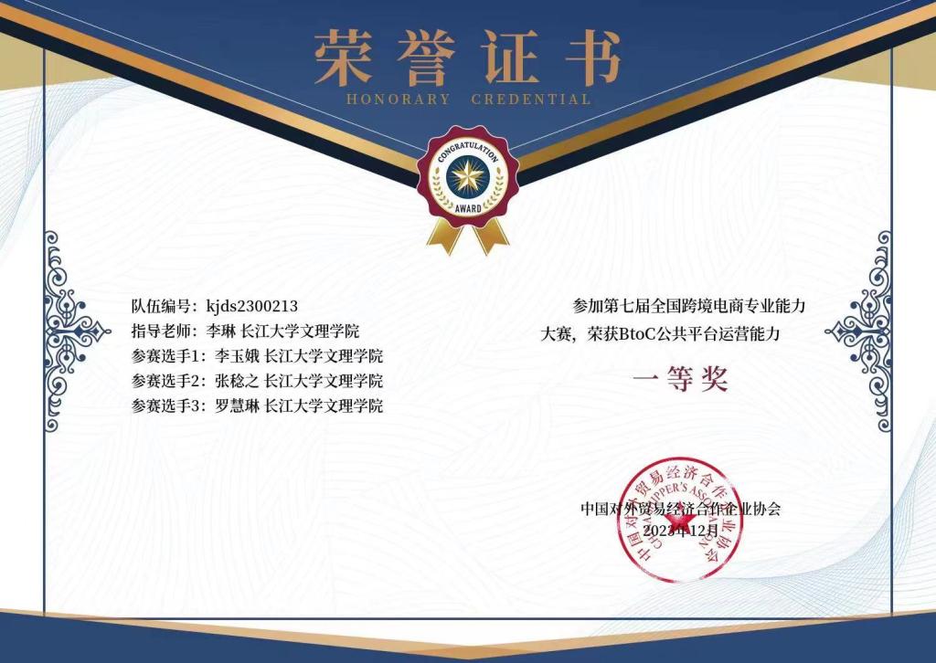 在中国对外贸易经济合作企业协会主办的第七届全国跨境电商专业能力大赛中,由李琳老师指导,李玉娥、张稔之、罗慧琳团队获Btoc公共平台运营能力一等奖,李美乐团队、杨子欣团队获二等奖。VSport荣获银奖。