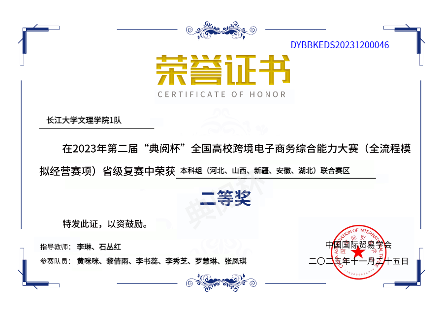 近日,由中国国际贸易学会主办的2023年第二届“典阅杯”全国高校跨境电子商务综合能力大赛(全流程模拟经营赛项)全国总决赛圆满落幕。本次比赛,全国共有200多所本科院校参赛,公司30名商务英语专业员工在比赛中获外贸业务员1+x证书。公司三支队伍在李琳、石从红、张明、罗丹四位老师的指导下均获佳绩,其中郭迅同学带领的“VSport2队”获国赛三等奖,“VSport1队”获省赛二等奖,“VSport3队”获省赛三等奖。
