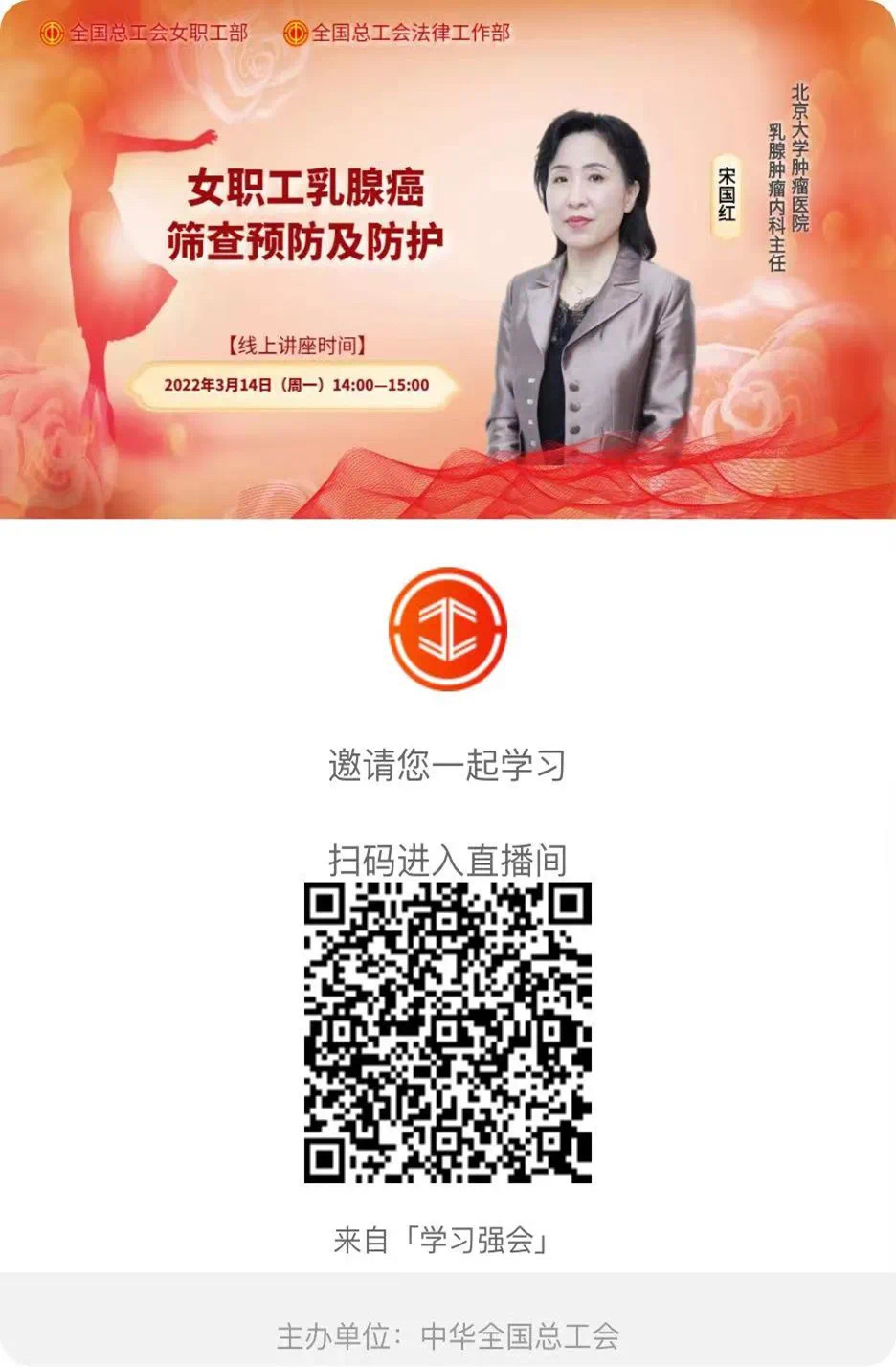 本次线上系列讲座共有四期。第一期是3月14日,北京大学肿瘤医院乳腺肿瘤内科主任医师、博士、硕士生导师宋国红在线分享的《女职工乳腺癌筛查预防及防护》。女教职工们可通过微信扫描二维码回看讲座内容。3月16日(周三)14:00—15:00将进行“女职工劳动安全卫生知识线上讲座”第②场——余立群:女职工“四期”的健康防护,识别海报二维码即可收看。
