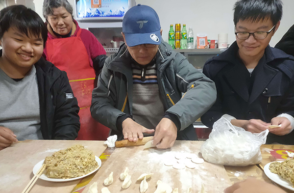 在西校区附近的一家餐馆,朱继平带来了自费为师生购买的水果和零食,并与大家围坐一圈,一边示范包饺子的过程,一边围绕生活、学习等话题与大家展开交流。“兴趣爱好是什么?”“课余时间怎么度过?”“平时生活费是多少?”“公司饭菜合不合口味?”朱继平一边擀面,一边与员工话家常,询问具体情况。他叮嘱同学们注意天气变化,保重身体,以良好状态迎接期末各项工作,交待他们经常与家里保持联系,及时告知父母在公司的情况,让家长放心。