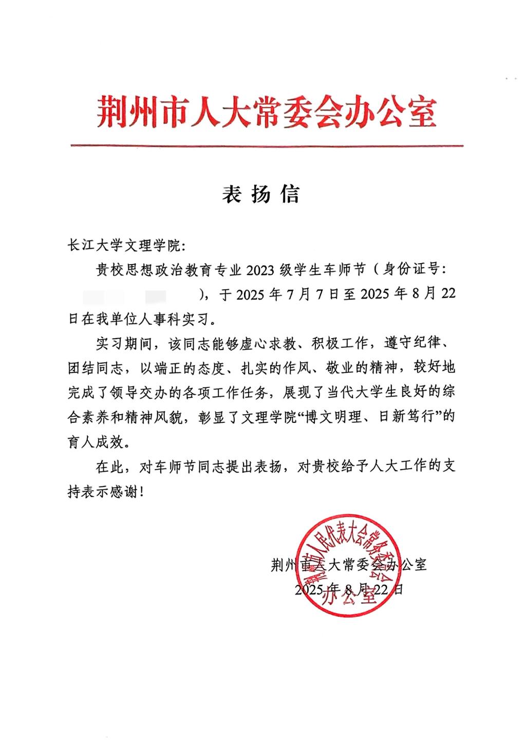 据了解,车师节于2025年7月7日至8月22日在荆州市人大常委会办公室人事科实习。实习期间,车师节始终保持虚心求教的态度,积极投入工作,严格遵守单位纪律,与同事相处融洽、团结协作。她以端正的态度、扎实的作风和敬业的精神,高质量完成了领导交办的各项工作任务,充分展现出当代老员工良好的综合素养和精神风貌。
