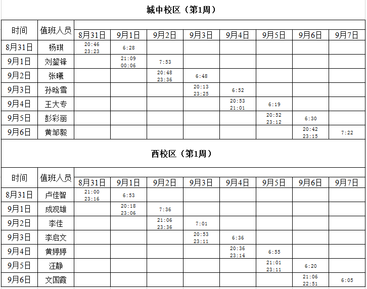 2020-2021学年第一学期第1周学工人员寝室值班通报