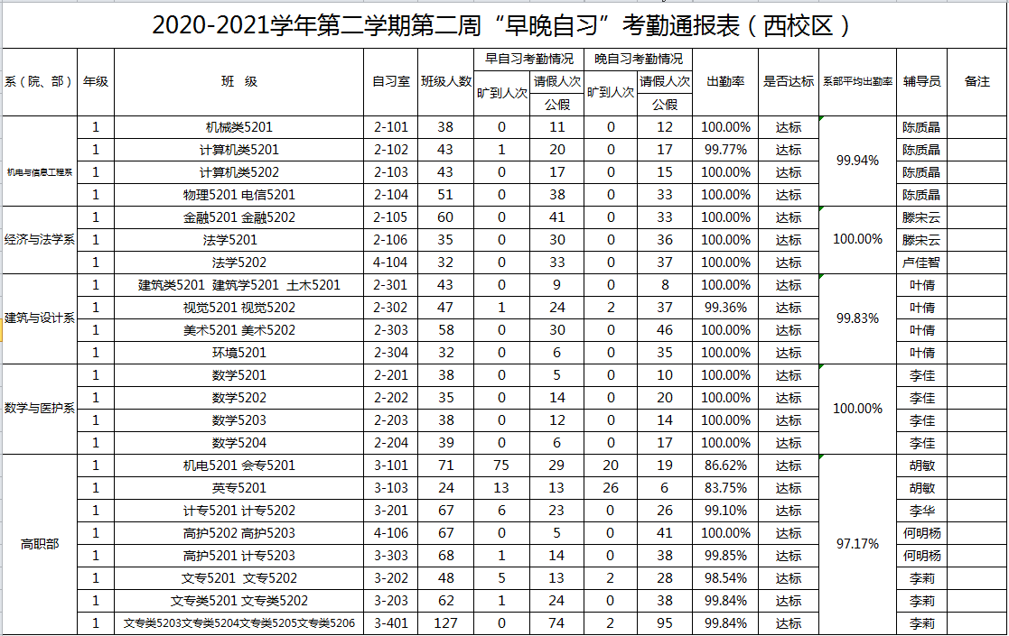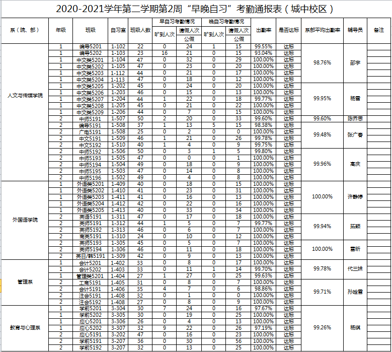 2020-2021学年第二学期第2周系(院、部)早晚自习考勤通报