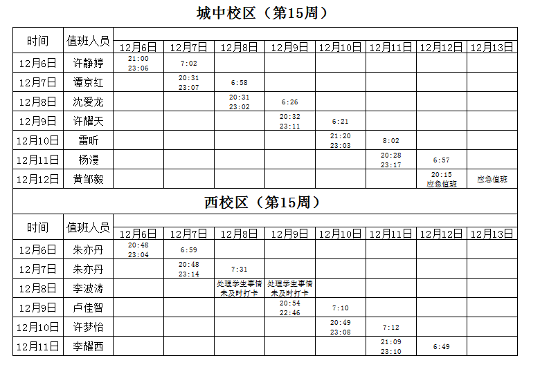 2021-2022学年第1学期第15周学工人员寝室值班通报