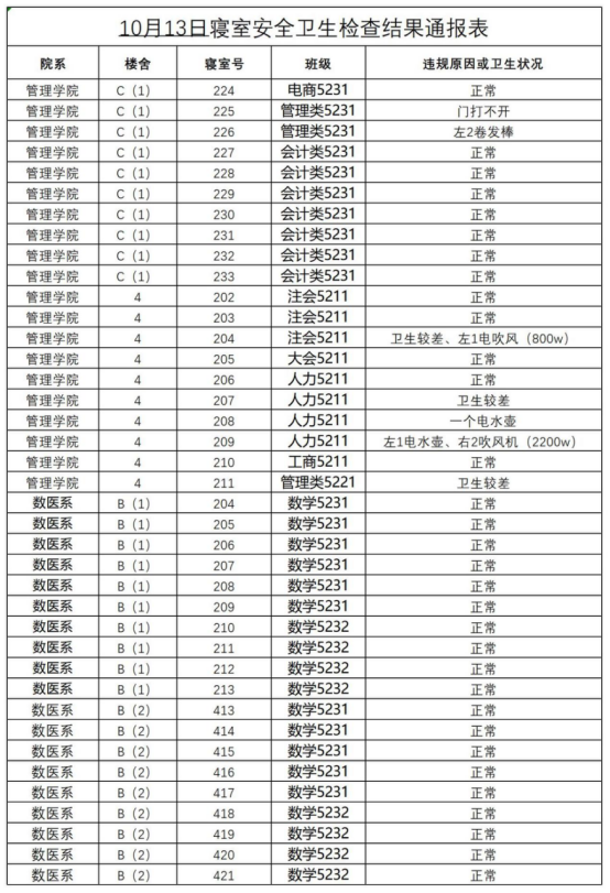 2023-2024学年第一学期第7周寝室安全卫生检查结果通报