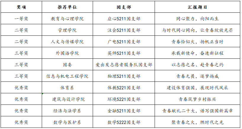 根据《关于在全省高校共青团组织中继续深化“百生讲坛”——学习宣传贯彻习近平新时代中国特色社会主义思想活动的通知》要求,按照评选细则,经团支部申报、各公司团总支推荐、校级校赛选拔,现将获奖名单公示如下,同时院团委将报送前五名的团支部至团省委参与省级“百生讲坛”活力团支部选拔活动。