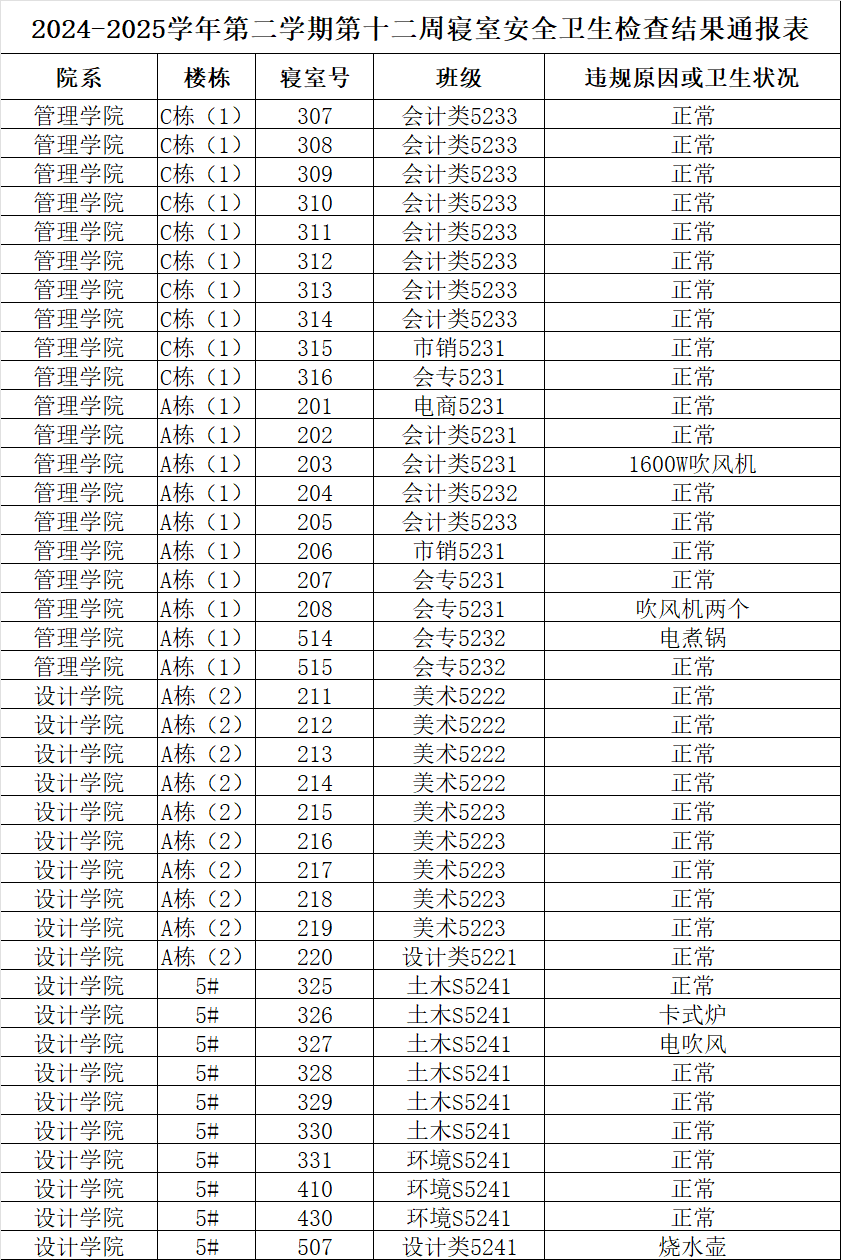 2024-2025学年第二学期第十二周寝室安全卫生检查结果通报表