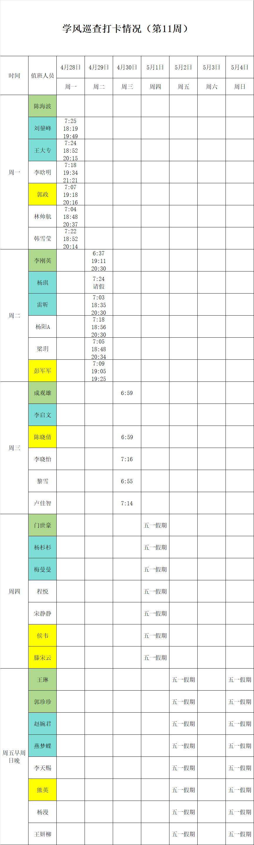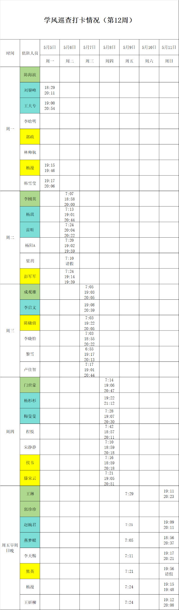 2024-2025学年第二学期第11-12周学风巡查打卡情况公示