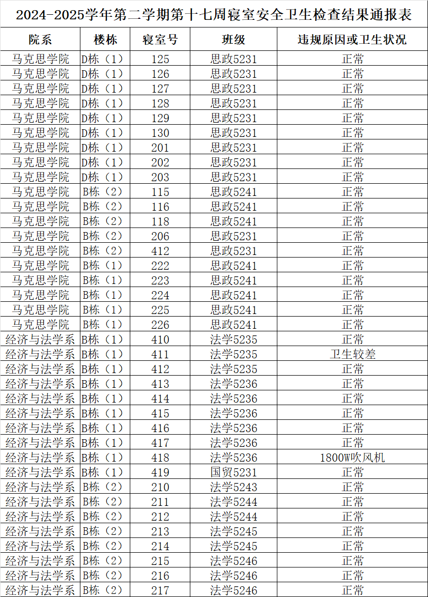 2024-2025学年第二学期第十七周寝室安全卫生检查结果通报表