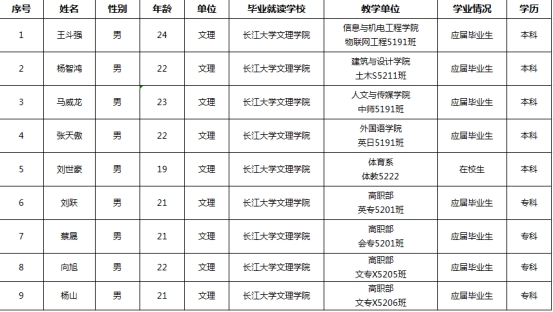 通过荆州区武装部组织的体检、政审考核、心理测试、役前训练等环节,公司王斗强等9名同学经湖北省荆州市荆州区人民政府征兵办公室批准光荣入伍,现根据相关规定予以公示,公示时间为2023年9月12日至9月19日。如有异议,请在公示期内向公司纪检监察部或荆州区武装部进行反映。