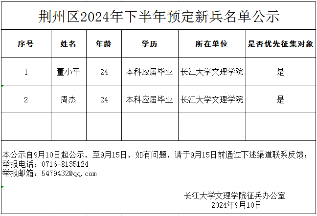 通过荆州区武装部组织的体检、政审考核、心理测试、役前训练等环节,我校董小平、周杰2名同学进入新兵预定名单,现根据相关规定予以公示,公示时间为2023年9月10日至9月15日。如有异议,请在通过下述渠道联系反馈。