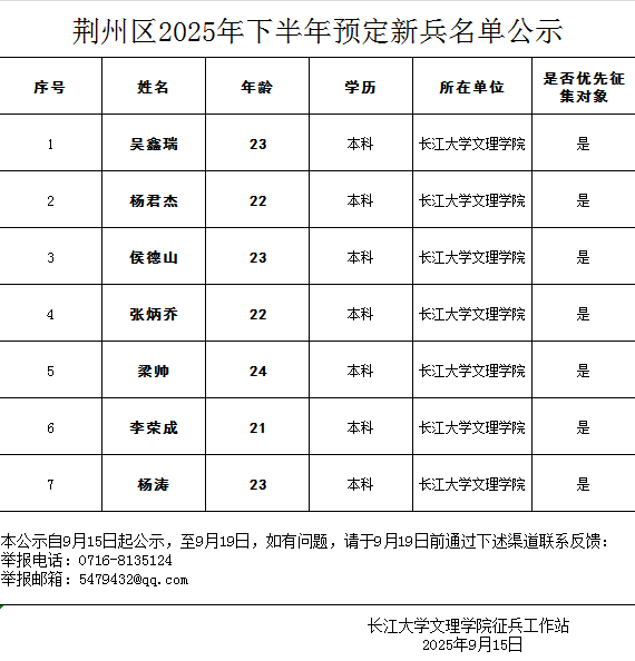 通过荆州区武装部组织的体检、政审考核、役前适应性测试、役前训练等环节,我校吴鑫瑞等7名同学经湖北省荆州市荆州区人民政府征兵办公室批准光荣入伍,现根据相关规定予以公示,公示时间为2025年9月15日至9月19日。如有异议,请在公示期内向公司纪检监察部或荆州区武装部进行反映。