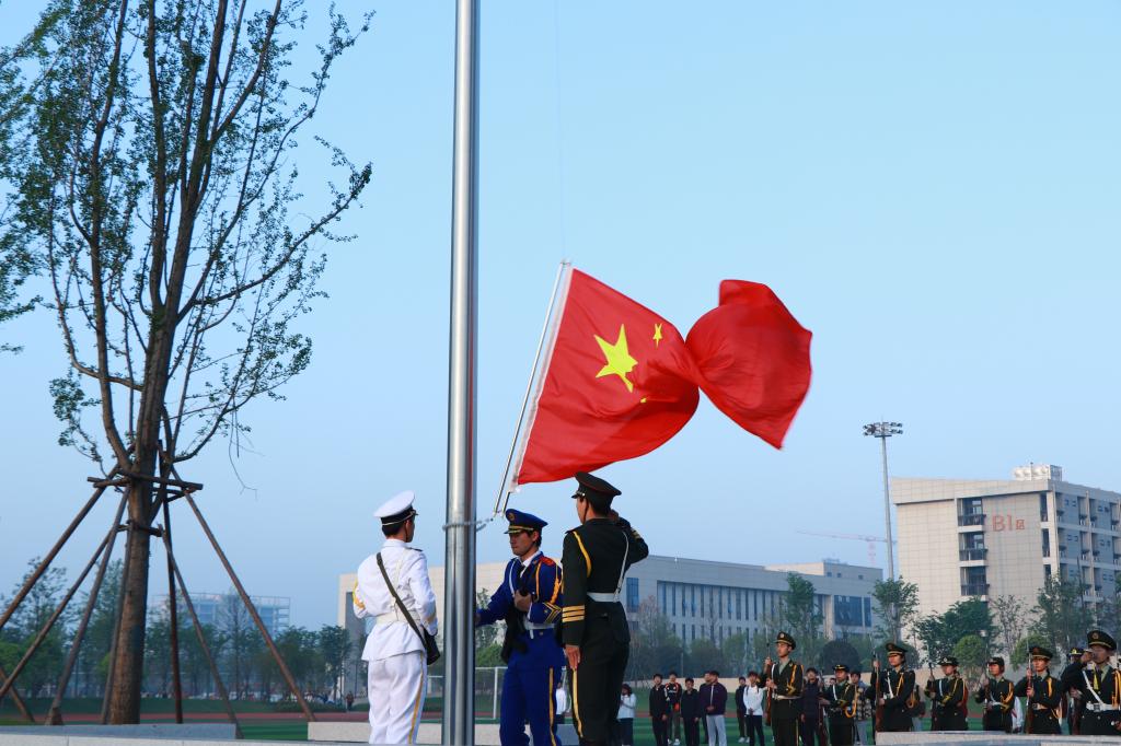 仪式开始,国旗护卫队迈着矫健的步伐护送国旗至主席台,随着激昂的国歌响起,全体师生高唱国歌,注视着五星红旗冉冉升起。