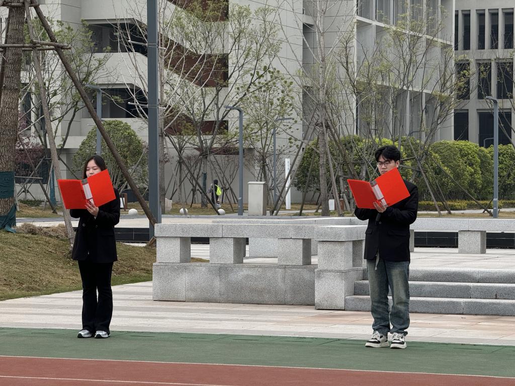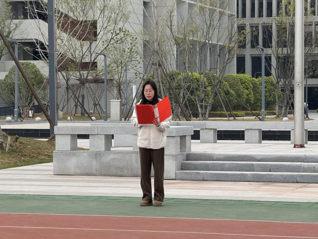 升旗仪式上,“红色话筒”辅导员工作室负责人李艺欣老师以革命先烈事迹为引,强调当铭记历史,以先烈为榜样,勇担时代使命。随后,优秀员工代表朗诵诗篇《山河念,英魂祭》,以深沉语调再现先烈浴血奋战的壮烈场景,感受先烈们的爱国情怀,现场氛围庄严肃穆。