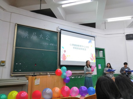 随着主持人致开场词,换届大会正式开始,主席和部长代表依次上台发言,对心联过往的工作进行总结,对未来工作的进行提出目标。随后由心理健康教育中心的主任李刚英老师上台发言,讲述了心联过去的变化以及对心联的发展抱有很高的期望,最后播放了往届心联成员活动的快闪剪辑,充分展示了老员工心理联合会这个大家庭的热情与活力,让大一的新干事们感受到了家的温暖。
