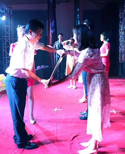梅平(中)、杨春(右七)共同为十佳老员工颁奖