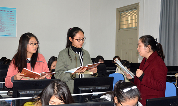 宽敞明亮的语音实验室里,51名大一同学目光灼灼,端坐于电脑前,潜心学习;任课教师面带微笑,熟练应用多媒体技术,悉心教学。