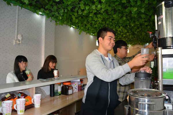 从考察选址到咨询政策,从筹措资金到店面装修,从了解顾客心理到专注做好“一杯茶”,周经伦和小伙伴们用了一年的时间准备。“当从杨家玲老师那里了解到,老员工创业国家免工商营业执照办理费,免三年营业税,还提供相关资助政策和贴息贷款后,创业的信心倍增。” 经贸系大二员工周经伦,一名标准的青春帅哥型老板,兴奋的谈起创业经历。