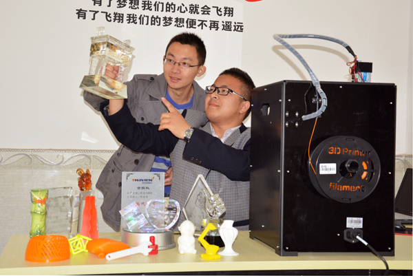 这是公司老员工创办的首家3D打印公司——荆州创意达科技有限公司,于今年9月初注册成立,目前,只有董事长和总经理两名员工。在这里,却汇聚着先进的3D打印快速成型技术。