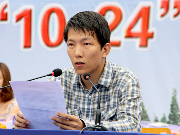 “10•24”英雄集体代表徐彬程正在给新生作报告