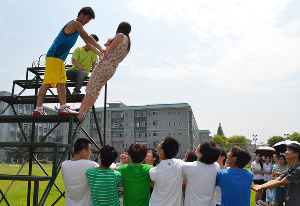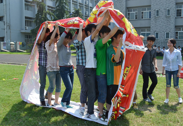无敌风火轮、信任背摔是同学们最受欢迎的游戏。同学们肩并肩站在事先准备的横幅里,巧妙的配合着走过终点。大家在体验刺激和惊险的同时,增进了相互间的信任。