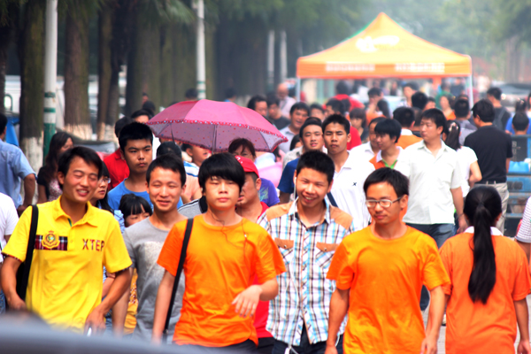 报到大厅是整个迎新现场最繁忙的地方,“大学从独立自主办理入学手续开始”醒目的标语提醒家长,只能在外面等候,新生凭录取通知书进入报到大厅,独立自主办理相关手续。资格审查是第一关,招生办公室工作人员通过扫描员工录取通知书上面的编码,进行信息确认,包括考生的姓名、籍贯、分数、身份证号码等基本信息,确认信息无误后,考生才能进入下一环节。收费现场一共设置了9个窗口,每个窗口分别配一名志愿者进行引导,向新生介绍各专业学费、寝室收费标准、教材费等,收费窗口的工作人员刷卡或者收取现金,然后打印发票,各项工作有条不紊,确保准确无误。