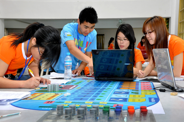 60名精英选手在指导老师张菊的统一部署下,分成12个小组,在模拟企业布局的沙盘上,进行紧张激烈的商道博弈。