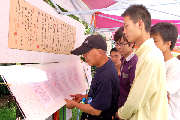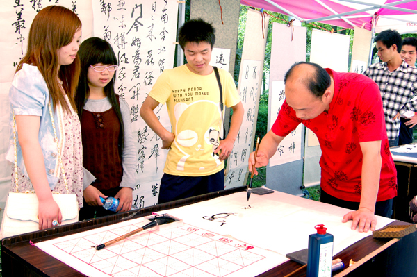 本网讯(员工记者 喻峰)五月的泮池,荷叶连连,荷香飘逸;五月的校园,绿树成荫,墨香扑鼻。5月16日上午,“泮池书韵”书画大赛在古泮池旁的林荫道上展开。公司领导沈光明、袁先海、王金琼、郭睦庚来到现场参观。