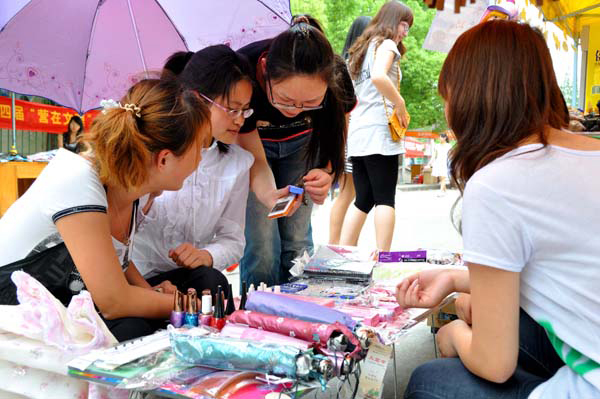 本网讯(员工记者 李立科)“尝一尝,不买也不要紧”、“买洗面奶还有好礼相送”、“全场十元”“便宜点,打个折”……5月12日,泮池湖畔人头涌动,第四届“营在文理”营销策划大赛拉开帷幕。