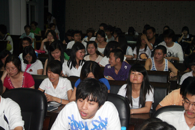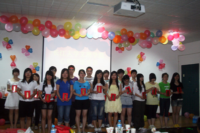 本次结业典礼前进行了一次以“唤醒人性心灵深处的爱”为主题的团体心理辅导,在热身活动中,“吹牛皮大比拼”锻炼了同学们的勇气;双人顶气球接力强调了合作精神;“瞎子背瘸子”体现了人与人之间的信任,同学们渐渐的进入状态,敞开了自己的心扉。最后一项“感恩生命”活动将现场气氛推向高潮,这个心理团体辅导是以模拟飞机坠毁为背景,乘客在生命最后的20分钟写下自己的遗嘱,以此唤醒人内心深处的爱,引发对生命意义的思考,从而时时刻刻地学会感恩生命,珍惜现在。
