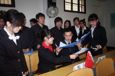 据班长陈磊介绍,虽然这是一场模拟的谈判会,但同学们都十分重视,无论是服装还是材料,大家都做了充分的准备。谈判会分两场,针对两个不同的情境展开。任课老师王华强简单讲解谈判会流程后,第一小组“中国钢铁协会”与“两拓、淡水河谷矿金联合会”的谈判就正式开始了。首先是主办方“中国钢铁协会”欢迎客方进场,然后由主持人介绍谈判的背景和主题,接着,一番唇枪舌战便展开了,双方通过数字、图表以及图像生动形象的向对方展示着自己的优势和实力。经过近45分钟的谈判与协商,双方最后达成一致并签订合同。一场精彩的谈判落下帷幕,紧接着第二组同学又开始了另一场精彩的“谈判”。