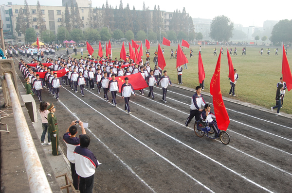 10月16日早上8点,公司第五届田径运动会开幕,伴随着雄壮的国歌声,师生们肃然起敬,五星红旗冉冉升起。在操场上,在理工学部的旗帜下,一个男生用双手撑着轮椅,努力站立起来面朝国旗,认真地唱着国歌。这个男生就是理工学部通信5081班的金冬。他虽然不能像其他同学那样自由行动,但他依然以自己独特的方式参加运动会。