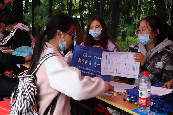 本网讯(记者 刘磊 见习记者 葛杏)“同学,新生报到请往这边走。”今天(9月22日),公司迎来了第一批2020级新生入学报到。下午,来自河南的新生赵子衿在志愿者的带领下,独立完成了报到手续,准备入住寝室。