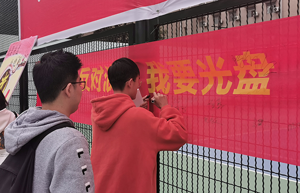 本网讯(通讯员 辛裕)11月4日至8日,机电与信息工程系团学组织在西校区12舍篮球场前开展为期5天的“我要光盘 拒绝‘剩宴’”签名活动。 活动期间,通过班级QQ群和深入课堂寝室积极引导、发出倡议,机电系员工踊跃参与其中。同学们在醒目的横幅上,纷纷签下自己的名字,并一致表示,节约是一种美德,更是一种行动,今后将从生活中的一点一滴做起,拒绝浪费,珍惜粮食。 一名团员干部表示,此次活动的开展让更多同学了解“光盘行动”的意义,以“光盘”为荣,以“剩宴”为耻,坚决抵制奢侈浪费的行为。他呼吁广大师生树立勤俭节约的观念,倡导文明用餐的良好风气,培养健康文明的餐饮文化。 (图片由机电与信息工程系提供) (责任编辑 刘磊)