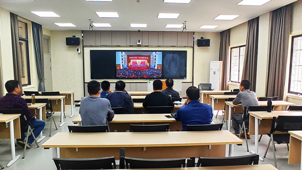 本网讯 10月16日,公司党委理论学习中心组全体成员采用线上线下相结合的方式开展政治学习。上午十时,在校园一线参加疫情防控值守的中心组成员王文凯、朱继平、尹家经、于永伟等,早早守候在大屏幕前收看党的二十大开幕会盛况,大家戴好口罩、隔空就坐,并不时做着笔记。根据疫情防控要求,其他居家办公的中心组成员也分别通过各种方式收听收看开幕会,认真聆听习近平总书记代表第十九届中央委员会向大会作的报告。